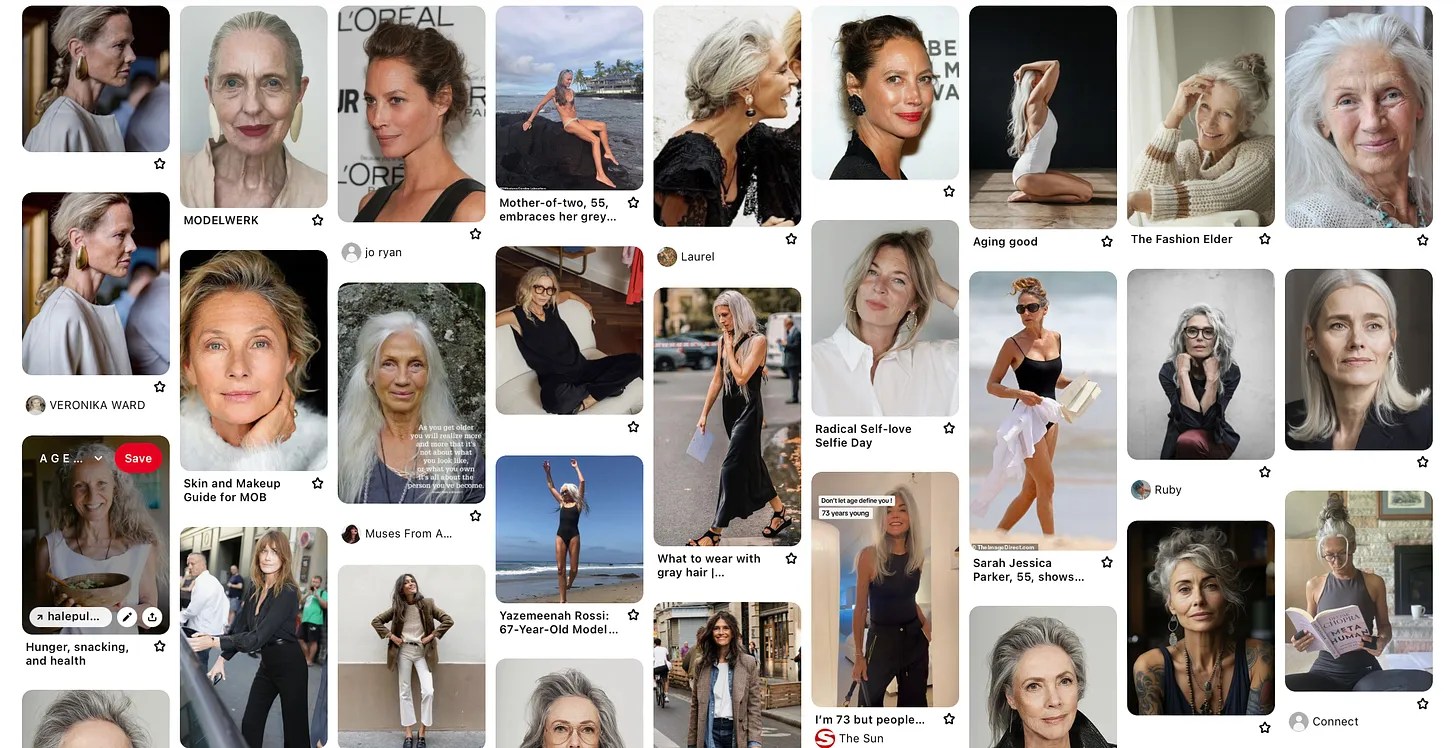 I have a Pinterest board of women, ageing gracefully. They are wrinkling, greying, vibrant, alive and beautiful. In a world that fetishises youth like it’s the last avocado toast on Earth, I created this board and look at it frequently to prime my brain for the future.